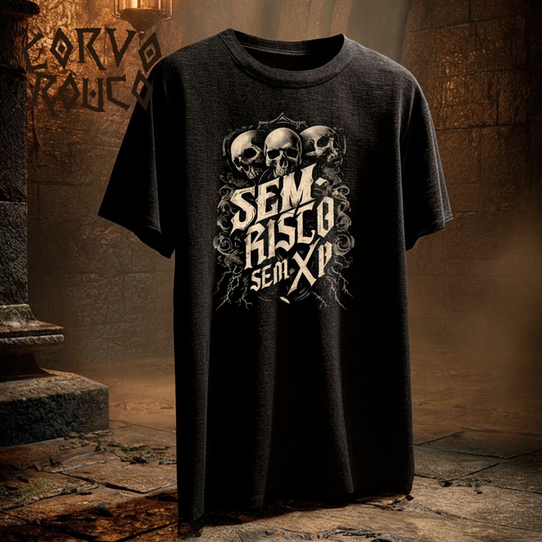 A Sem Risco, Sem XP é o lembrete estampado de que todo crítico nasce do perigo — e que só quem encara o caos merece o brilho do XP. Feita pra quem mergulha na dungeon de cabeça, desafia o destino e ri na cara do TPK.